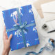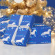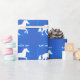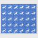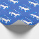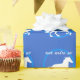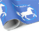 En söt vit häst silohouette går över den blå pappra inslagningen. Hästen backas upp av en ljusblå cirkel ram och ord grattis på födelsedagen i Hebrew över varje bricka (Yom Huledet Sameach).