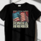 Här är en T-shirt-skjorta för minnesdagen som har en amerikansk flagga vintage-stil med frasen "heder och minne" i fet, tryckt typografi. 🇺 🇸 ✨