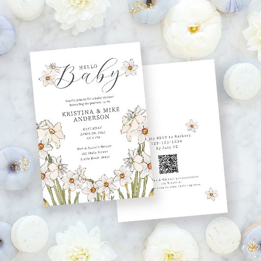 Säg "Hej Baby" med solnyare Vår Daffodils, en enkel inbjudan till babydusch med en utformning av vintage-dilater | narcissus ramar noggrant vald text. Baksidan har den enkla blomman mönster. Med den här fina designen anpassar du bara skriptet efter dina behov.