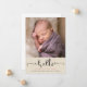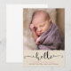 Detta enkla födelsemeddelande med ännu elegant visar ordens "hej" i en modern manustypografi. Grund-delen av kortet har ett slitet pappert utseende, medan den översta visningen ger dig ett nytt foto. Personalisera med baby födelseinformation. Fotografi © Storytree Studios, Stanford, CA