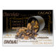 Konstruktionen är försedd med chokladbitar och mandlar som läcker från en svart ramekin med en svart och vit vågrät och ett textblock av ord choklad, mörk choklad och mandlar på engelska, tyska och Fransk plus mer ord i en mängd olika typsnitt av stilar, storlek och färg. Anpassa insidan av hälsning med ditt meddelande eller ta bort texten.