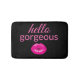 Förbered badrumsdekoratet med den här anpassningsbarna "Hej Gorgous" Bath Mat. Den här designen innehåller en bild av glansig rosa läppar tillsammans med rosa teckensnitt som ställs in mot svart bakgrund.