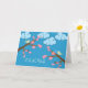 Hej i japanska, Konichiwa-, Birds- och Cherry-Blommar, pappert hälsningskort. Kortet har en digital illustration av körsbärs-blommar, puffa moln och ett par fåglar. En av fåglarna jagar Hej till den andra. gröntar för färg av nyp, blues och blek. Art, bild och versell copyright © Shoaff Ballanger Studios.