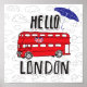 Hej London-handskriftstecknet med paraply, rött buss och Förenade kungarikets flagga i form av hjärta på moln. | © and ® Bigstock® - Med förbehåll för alla Höger.