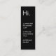 Vi hälsar dina kunder/kunder med vårt trendig och det moderna "Hi"-affärskortet. Enkel, svart och vit design med "Hi" som visas på en framträdande plats överst för att hälsa dina kunder. Kontaktinformationen visas i en ren och modern layout mot en svart bakgrund med vit rik. Den omvända sidan har en vit design med namn och titeln i svart.