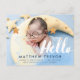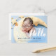 Vit script typografi med ordet "hej" foto drömmiga blå moln överlägg och guldstjärnor design. Foto Baby Födelse Annonserings Kort för en pojke pojke