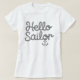 Den här vita t-shirten har texten "Hello Sailor" i ett lekfullt, rep-liknande svart teckensnitt. Under texten finns en enkel svart ankar-grafik. Designen är nautiskt tematisk och antyder en rolig, avslappnad stil. Den kan bäras till en möhippa eller någon annan händelse med segeltema.