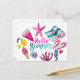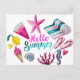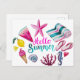 Hej Sommar med stjärnfisk, strandduk, sjöfågel, flinflip flops, glass, citron, havs-ogräs, vattenmelon och snäcka på vit bakgrund.