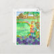Ett vykort för roligt för dem som njuter av med en kvinna i en ljusröd apron som vattnar sina sommarblommor med stora lila-alliumblommor i fullt blomma. Underbar till behålla i kontakt med vänner!
