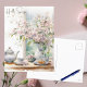 vykort i vår med vattenfärgstativ för sommartid. Sammansättningen omfattar en rustik bord i ett solbelyst fönster, försedd med porslinsfärgad tekanna, tekopp och en platta med pastöriser. En vas fylld med blommande rosa och vita blommor, möjligen körsbärsblommor eller äppelblommar, ger en färsk och livfull beröring till scenen. Bakgrunden består av ett mjukt fönster med lätt bryggning som föreslås av det strömmande grenarna. Uttrycket "Hej Vår" är elegant skrivet i det övre lämnat hörnet, vilket förbättrar den varma, välkomnande atmosfären. Paletten färg består av mjuka pastellhuvar, främst skuggor av rosa, grönt och blått, som skapar en serenkänning och nostalgi.
