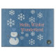 En slice of Life and Delight presenter Hej, Winter Wonderland dekorative glass cut board. Snögubbe är dekorerat med vitt snöflingor, rosa och blå bakgrund. Snögubbe har också en blå hatt och halsduk.