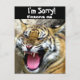 En tiger med munnen öppen, tänder som visar, underbar för: Förlåt, förlåt mig, hej och mer.