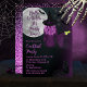 "Hej Witches, det är Party-tid!" Halloween "Cocktail Party"-design med baksidan av en häxa med långflytande lila lås och en lila klänning och häxhatt och som håller vad som verkar vara en margarita medan fladdermus sväljer runt huvudet mot ett månbelyst himlar. Hennes välkända svarta katt tittar på underifrån. Baksidan har en lila faux glitter-bakgrund. Sammansatt design efter Helgdag Hearts-design.