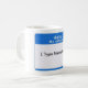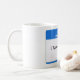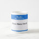 Kaffekoppen med en blått "hejer mitt namn är" namn bricka på den.