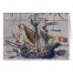 Antikaj karta i Stilla havet med en färgfull lång frakt eller gallon som passerar genom vågar med en ängel vid bågen för att styra frakten till säker passage. Besättningen förbereder seglarna och svabben på däck.