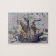 Karta i Stillahavsområdet med en färgstark lång frakt eller gallon som passerar genom vågar med en ängelfigur på bågen för att styra frakten till säker passage. Besättningen är på däck och förbereder seglarna och sväljer däcket.