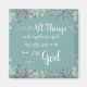 Magnet med tryckt vit typografi på texturerad akvatisk bakgrund omgiven av vattenfärgade blommor, med välkänd vers från Romans 8:28, ".. All sak arbetar tillsammans för bra för dem som kärlek Gud.."