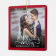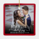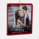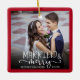 Denna vackra julprydnad är en underbar keepsaké för nylingarna. Utformningen erbjuder ett fyrkantigt foto ram med mörk röd gräns och accentueras med handskriven stil-kalligrafi "Married & Merry" som är en vit övertäckning på fotot. Anpassa med namn av bruden och brudgummen och deras bröllop-datum.