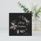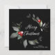 Det här moderna, vackra fyrkantiga helgdag har elegant med vattenfärgade röda hornbär med grön och elegant guldkvistar på svart bakgrund med handskriven text i vitt God jul. Kortets baksida är en enkel svart som matchar framsidan.