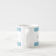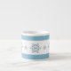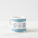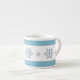 Denna espresso mugg visas i ett blått söt på vitt med mjukt grått accent rand med bilder av gulsot snöflingor i olika storlekar genom mitten av mugg. Anpassa det här objektet eller köp som designat.