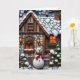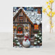 Ett charmerande julkort med en illustration som imiterar ett mosaiskt stil med en nedfläckad och en julstuga med snögubbe framför, snö täckta buskar, ett belyst fönster, på en snövinter kväll. Meddelandet i kortet kan vara personlig till önskad spelar ingen roll skriva.