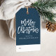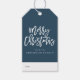 Ge din helgdag är en wow med moderna märkre för gåvor till helgdag. Anpassningsbar helgdag presenterar märkre med "God jul" i ett trendig-skript, en marin bakgrund och en mönster i gräs träd på baksidan av designen.