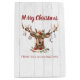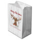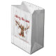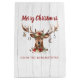 Cute Rustic-julens Hjort Ornaments Helgdag Gift Bag med en vacker hjort med prydnadsämnen och rustika helgdag blommor och gräs grenar mot en vit träbakgrund. Perfektens tillägg till era helgdagskort och paket i år!