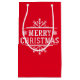 Den här presentpåsen i helgdag visas med en God jul-snöflingor-utskrift i festen. Bag färg är Red Anpassa det här objektet eller köp som det är.