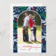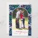 Det här platta julhälsningskortet har ett modernt lodrät med ett upphöjt foto ram som accentueras med en gräns av vintergröna. Eleganten har skripttext och en mörk blått bakgrund. Fotografi © Storytree Studios, Stanford, CA