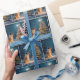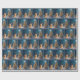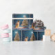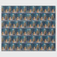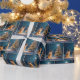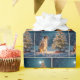 En hund ligger bredvid en Julgran som täcks av snö och som är försedd med ljus och prydnadsföremål, som baskar i glöden av en seren, snönatten