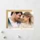 Det här vackra fotokortet med ditt favoritfoto från bröllop och ord, "Gift jul!" i ett modernt skript från guld och ditt namn och året i ett rent klassiskt teckensnitt kommer att ge varje mottagares ansikte ett leende. Alla kommer att tycka om att höra dina stora nyheter och få ett foto av dig från bröllop.