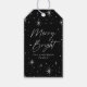 Elegant och moderna helgdag med märkre med "Merry and Bright" som visas i ett vitt, handskript som ramas av en gräns av vita stjärnor med svart bakgrund. Anpassa märkrna för merry och smart presenter genom att lägga till ditt namn.