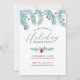 Gräs blå fir grenar och liten röd bärgning skisserade helgdag-middagsinbjudan. Perfekt för helgdag. Vit bakgrund med blå grönt, röd och svart text och akvblått grönt gräs och små röda bär skisserade grafiskt mönster. Art och designad av Sarah Trett för www.mylittleeden.com
