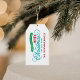 märkre för presenter i helgdag med anpassningsbar. Den här festliga designen har vit typografi i rött, grönt och turkos färg. Budskapet löd: "Önskar dig mycket God jul". Använda verktyg för att redigera typsnitt och färg.