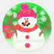 De runda klistermärkena i lycklig har en lycklig snögubbe som har en stark vinterhatt för rosa och orange och en sjal i grönt med många vita snöflingor! Leta efter matchande Julhälsningar kort, adressetiketter, frimärke och kuvert från snögubbe!