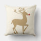 Säsong julen dekorativ kudde har en neutralt färgad stag renar med silhuetdesign som är nyttigt och som har ett nyttigt, högbrunt texturerat utseende och en ljusröd näsa. Ett mönster med vitt vågrät, rött och mjukt vitt/lätt elfenben rand ligger längst bak i kudden.