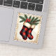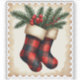 Ett festligt porträtt i frimärke med en skuren julklapp fylld med hullbär och gräs nål mot bakgrund av vintage-stil.
