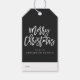 Ge din helgdag är en wow med moderna märkre för gåvor till helgdag. Märkrna i helgdag av anpassningsbar har "God jul" i ett trendig-skript, svart bakgrund och gräs träd mönster på baksidan av designen.