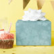 En snöstorm av teal färgad snöflingor som faller ner på en mörkare teal, texturerad papper.