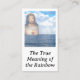 Framsidan har den vackra bilden av Jesus Helig Heart i ett ovalt gräns som tittar en regnbåge över vatten. Ord, "The True Meaning of the Rainbow", visas under bilden. Orden av vår Herre har en omvänd innebörd av regnet som hans pakt med världen. Gud lovade att regnbågen är ett tecken på hans löfte att han aldrig mer kommer att förstöra hela jorden med en översvämning. Regnbågen har inget med synd att göra. Det finns aldrig tid att vara stolt över våra synder. Allt som går emot Guds vilja är synligt. Låt oss därför ta tillbaka regnbågen och främja dess sanna innebörd, som fastställts av Gud. Använda korten för att hjälpa honom att sprida sitt löfte!