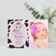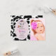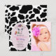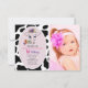Söt, rosa helig ko med blomkrona 1-års inbjudan med foto och ko-mönster.