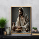 Jesus sitter vid en enkel bord, klädd i en blommande vit rob med ett huvud som täcker, förkroppsligar ödmjukhet och nåd. Hans händer håller delikataktigt en biet bröd när han utför helig-handlingen att bryta det. Det här ögonblicket betecknar den sista fadern, en hörnsten i den kristna teologin och en symbol för kärlek, enighet och uppoffring. Scenen är fredlig och tankeväckande. Förutom honom vilar två lerkärl: ett som liknar en vin-jug, framkallar hans blod och ett annat som gör att inställningen blir enklare. En vävd basket, fylld med nybakade vågor, betyder överflöd och gudomlig tillgång. Jesus milda uttryck utstrålar djup högtidlighet i andlig, teckning åskådaren in i det tysta heliga ögonblicket. Den blygsamma inslagen av bröd och vin symboliserar det djupa budskapet om ödmjukhet, service och näring av själen. Denna skildring uppmuntrar till eftertanke om Eukaristernas helighet och kärlek Jesus, som exemplifierades genom hans uppoffringar. Områdets enkelhet understryker vikten av rikedom i andlig framför materiella tillgångar. Denna bild väcker hängivenhet och uppmanar troende att återknyta till kärnan i sin tro och det eviga hoppets och räddningens budskap.