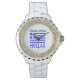 Armbandsur på grekiska flagga och ord, HELLAS, nedan i blått. Flagga visar blått och vitt rand med blått och vitt kor i det övre högerna. Lägg till ditt namn, i blå brev, för en personlig eller skapa en anpassad gåva. Roligt för familjeåterföreningar, resegrupper och för att dela kärlek och pride med ert arv, härstamning och er kultur. Underbar för att fira Oxi-dagen.