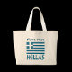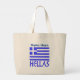 Stor shoppingväska med den grekiska flaggan och ordet HELLAS under i blått. Flaggan visar blå och vita ränder med ett blått och vitt kors i det övre högra området. Ovanför det läggs ett namn till, i blå bokstäver, för en personlig touch eller för att skapa en skräddarsydd present. Designen visas på båda sidor av väskan. Roligt att ta med till din grekiska familjeåterförening eller resegrupp. Också trevlig att hjälpa till att fira Oxi-dagen. Du kan ändra teckensnitt och färg på namnet genom att använda alternativet "redigera design".