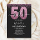 Hello 50! Invite your friends and family to celebrate the 50th birthday with this modern design. The design features a black background, the numbers thirty in faux pink glitter, with an elegant pink glitter background, elegant calligraphy script, a modern birthday template that's easy to personalize, and the option to add a photo to the reverse. Don't think about it and get yours now.