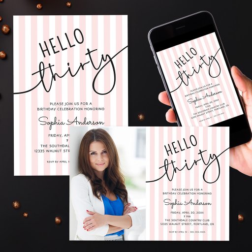Hello Thirty Modern Script Chic Stripes BirthdayDesignad av Linda Terwee
