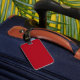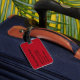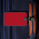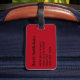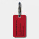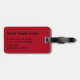 Bagagetagg med namn och adress på en solid mörk röd bakgrund färg. Anpassa med namn och adress-information med hjälp av de enkla mallarna. Teckensnitt färg, stil och storlekt teckensnitt är anpassade.