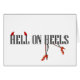 Formulera "helvete på häl" i svart, & skor den moderna kosmopolitiska stilsorten för vit med röda djävulenhorns ovanför ord, "helvete," och en kvinna ben som ha på sig den röda kickhälet, under ord, "häl.",