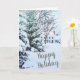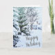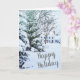 Lycklig Julhälsningar kort med träd täckt av snö och ett traditionellt tittar hem. Matchande returetikett för adress. https://www.zazzle.com/z/pejvr?rf=238828267405258083
