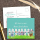 Kort för adressändring med ikoniskt vitt staket. Denna drömlika akvarellillustration av en vacker trädgård har en söt rödhake, fjäril, lavendel och penséer på gräsmattan framför det vita staketet. Designen finns på en ljus teal bakgrund med blekgrå handskriven typsnitt. Texten på baksidan lyder "Vi har flyttat och vill att du ska ha vår nya adress", följt av din nya adress, meddelande (valfritt) och namn. Denna design finns tillgänglig på alternativa typer av annonskort med matchande postmateriel. Bläddra bland vår samling för adressändring för alternativa designer.